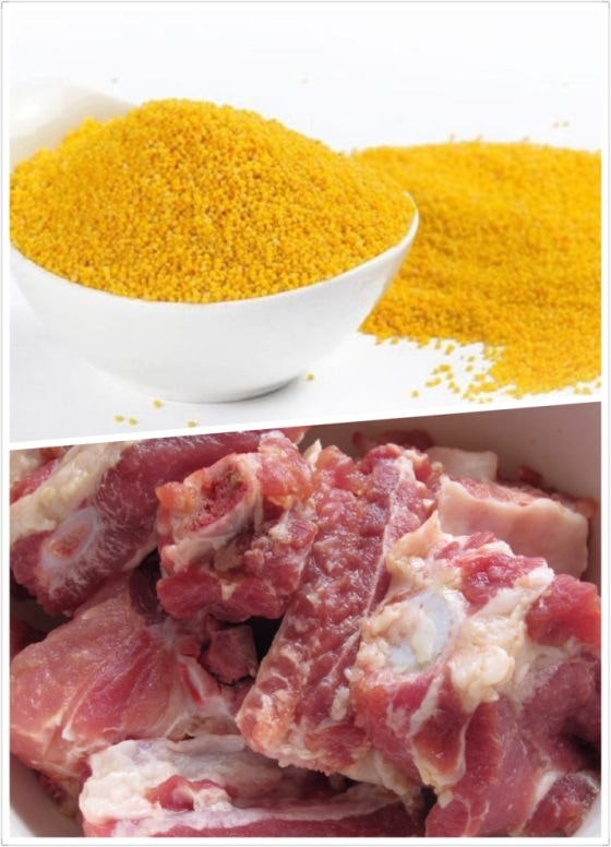 - 把小米弄乾然後加少許鹽後拌勻,然後再將醃好的排骨加入小米中拌勻。