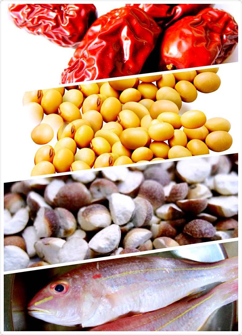 先將鮮魚洗淨煎香。黃豆、茨實、紅棗等材料洗淨加水12碗,煲大約1小時後,加入魚再煲半小時即可。