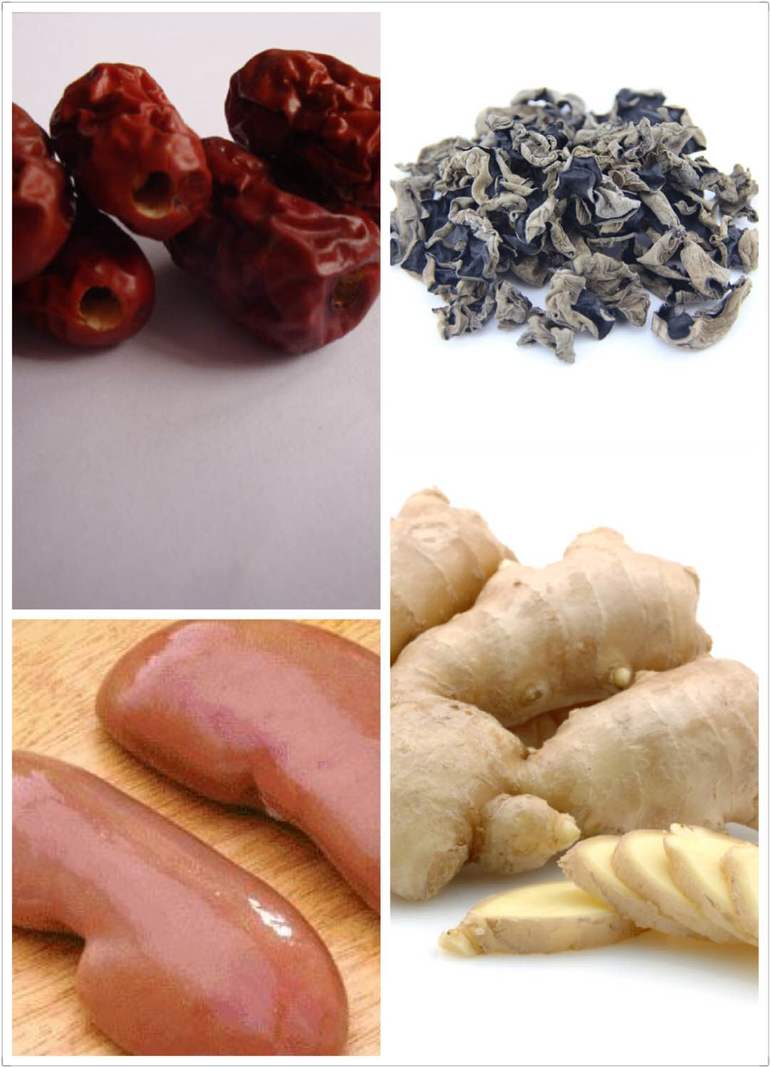制法:- 先將豬腰去白筋,並用粗鹽清洗去異味,汆水後切成腰花,然後加入調味料醃大約30分鐘。乾木耳浸軟,去硬蒂,並撕成適合食用的大小。燒熱油鑊,加入薑片爆香,將豬腰以大火快炒,再加入2湯匙米酒續炒大約2分鐘。最後將所有材料加2碗水以文火煮大約30分鐘。加鹽調味即成。