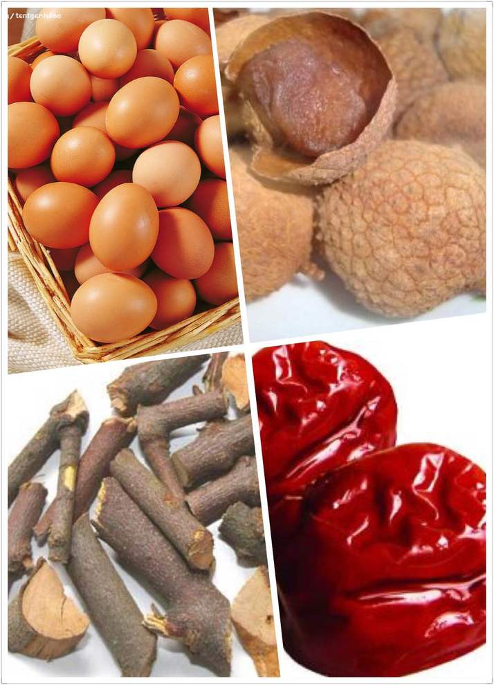 制法:- 先用刀切開大棗有助出味。全部材料用魚湯袋包好(荔枝乾去殼),。加入大約1500毫升水並以大火煮沸後,改文火煮約60分鐘。將蛋連殼加入藥茶中,煮至蛋熟。然後取出雞蛋並去掉蛋殼,放回藥中。最後加入1至2湯匙紅糖,煮至糖溶即可。
