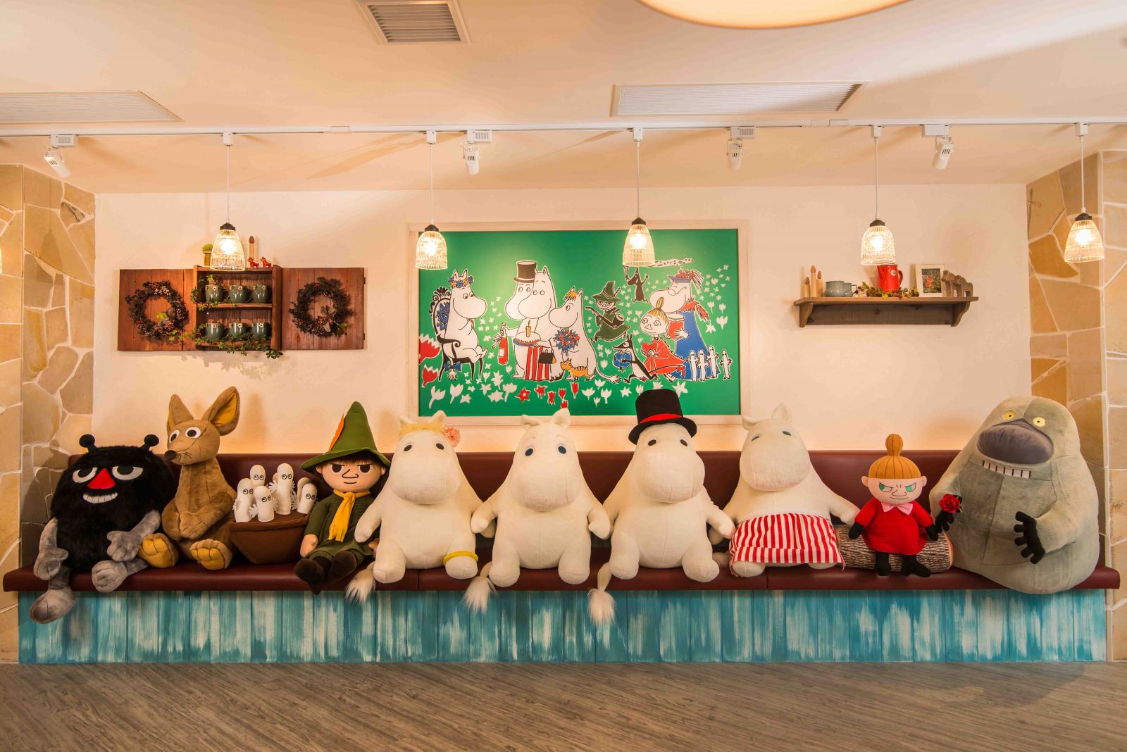 「Moomin café 嚕嚕米主題餐廳」店內設計以原著故事—「嚕嚕米小屋」場景為藍圖做設計,讓人一踏入店內就彷彿走入嚕嚕米的童話世界!除了牆面上畫有嚕嚕米原著插畫點綴,在店內許多角落也可以發現嚕嚕米一家的蹤跡。一旁還有門前陽台的裝置物設計,那正是故事中大夥兒最喜歡聚集聊天的地方,可以說處處都是驚喜。