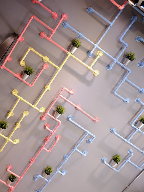 以俏皮韓系為風格的「F.lu ICE 芙露愛思」,店內有整片的粉嫩三色水管墻,拍照起來超繽紛,引爆網友們少女心,主打的水果綿綿冰不僅好吃也非常上相,讓這裏才開幕沒多久就充滿來朝聖的顧客。黃、紅、藍的三色細水管裝置於墻面上,彎彎曲曲不規則的擺向,卻意外營造出濃厚童趣感,成為最夯的打卡取景處,凡是來消費的客人,無不在此留下一張紀念照。