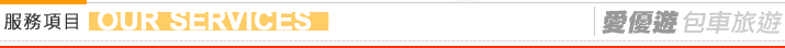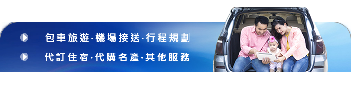 提供全台灣包車租車服務:自由行租車-FREE & EASY、商務洽公用車,台北半日遊、台北一日遊、台灣多日遊…等等,各種行程附帶駕駛包車租車業務。您只要告訴我們人數、成員(大人、小孩)內容、行李數量與大小,就能按照行程內容,為您安排最適當、最省錢的車輛,進行台北半日遊、台北一日遊、台北二日遊、台灣多日遊、台灣環島遊的不同行程活動。