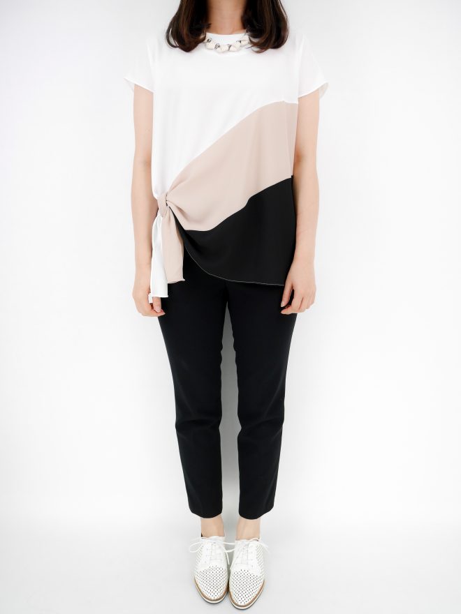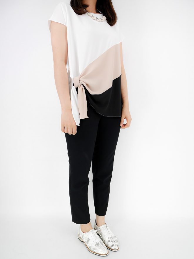 三色接拼打結雪紡上衣 – 白色